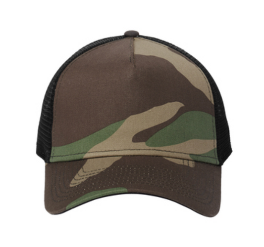Camo Trucker Hat with Sewn Faux Leather American Flag Patch